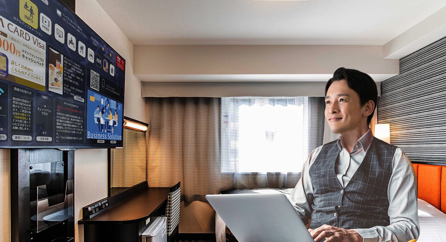 「おもチャンネル」は、ビジネスホテルの客室内テレビモニターを活用した動画広告メディアです。入室時にカードキーを差し込んだ際、照明が点灯すると同時にテレビが自動的に立ち上がり、音声付きでCM動画が流れます。