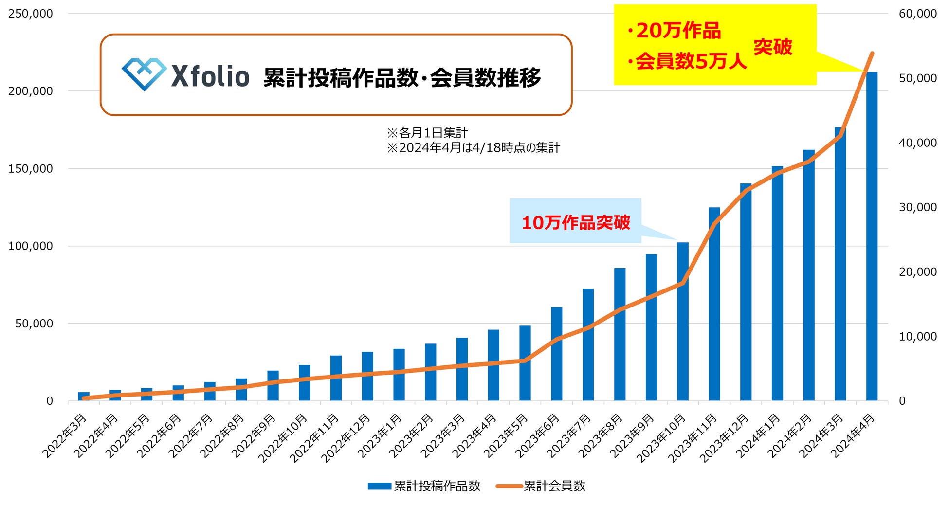 クリエイターにご利用いただき、2023年10月時点で累計投稿作品数が10万作品を突破、6ヶ月後の2024年4月に2倍の20万作品を突破しました。※1