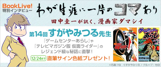 国内最大級約44万冊の電子書籍を取り扱う株式会社BookLive(本社:東京都港区、代表取締役社長 淡野 正、以下:当社)は、総合電子書籍ストア「BookLive!」にて、漫画家である田中圭一が人気漫画家の“渾身の一コマ”を訊くインタビューコーナー「わが生涯に一片のコマあり」(http://booklive.jp/feature/index/id/wagakoma14)の第14回として、『ゲームセンターあらし』のすがやみつる先生のインタビューを、本日より掲載します。