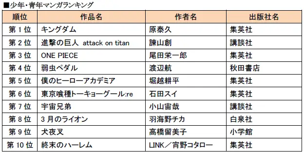 「マンガランキング」では、メディア露出の多い作品の中で、少年・青年マンガ第1位の『キングダム』(原泰久/集英社)は、一昨年バラエティ番組で取り上げられて以降トップを維持しています。