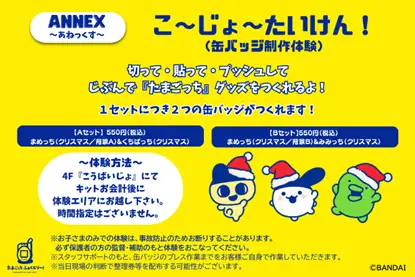 ・こ~ばいじょ(ショップ)での「みにたま つめほ~だい!」や「ワッペンワーク」、Tamagotchi Paradise本体の販売は行いません。販売するグッズは、3F『たまごっち ふぁくとり~!』と同様のラインナップを予定しておりますが、在庫状況等により一部お取り扱いのない商品が発生する場合がございます。